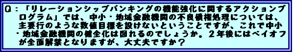 :主要行の場合は、後2年間で不良債権比率を半分にすることが、ある意味で不良債権問題の終結に繋がるというふうに考えているわけですけれども、この地域・中小の金融機関につきましては、地域・中小のリレーションシップバンキングの機能を強化して、地域に貢献する、それでいて地域に根差して収益力を持つ金融機関になっていただくことが実は問題の解決になって行くのだと、そういうふうに理解をしているわけです。その意味では不良債権の額等々が、その時に大手の場合と同じ様な形にはならないにしても、その機能を通じて、即ち社会に貢献出来るリレーションシップバンキングを担う機関としてその存在感を高めて、十分な機能を果たしていけるようになっていると、その様なイメージで考えております。