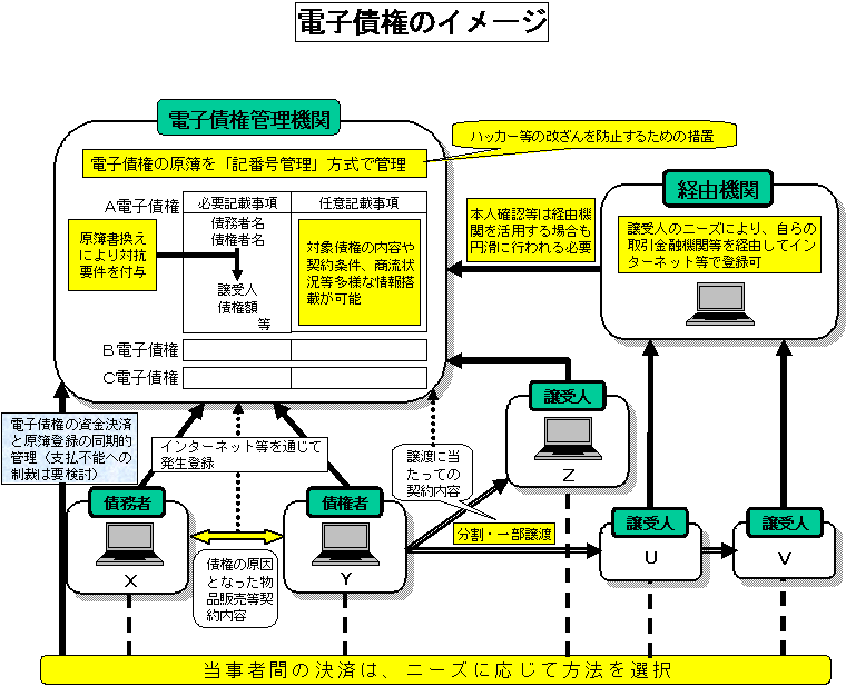 .「議論の整理」の概要 「議論の整理」において、電子債権は、「指名債権とも手形債権とも異なる新しい債権であり、売買等の原因契約とは別個に電子的手段により発生、譲渡されるもの」として位置づけられています。また、現行の指名債権の譲渡や手形制度に関して指摘されている課題を一体的に解決するだけでなく、様々な商流情報等の金融サービスにおける活用を可能にする等、将来の情報技術革新の成果を享受できる新たな金融インフラとして、我が国の金融システムにおける金融仲介機能及び決済機能を一層発展させ得るものであるとされ、具体的には下記のような効果が期待されています。 |