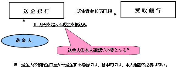 .10万円を超える送金を行う場合の取扱い この改正が施行される平成19年1月4日以降、10万円を超える現金の振込みを行う際には、金融機関の窓口において、運転免許証、健康保険証、パスポートなどの本人確認書類の提示が必要になります。ATMでは10万円を超える現金の振込みはできなくなるので、注意が必要です。 一方、現金でなく預貯金口座を通じて振込みを行う場合には、ATM、窓口のいずれにおいても、引き続き従来と同様のやり方で振込みを行うことが可能です(ただし、口座開設時に本人確認手続きが済んでいない場合には、本人確認書類の提示がないと振込みができないことがあります)。 |