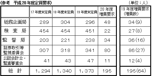 ※ 詳しくは、金融庁ホームページの「報道発表資料」から「平成20年度機構・定員及び予算要求について」(平成19年8月29日)にアクセスして下さい。