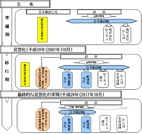 日本郵政株式会社の下で、郵便事業株式会社、郵便局株式会社、ゆうちょ銀行、及びかんぽ生命保険が営業を開始し、また、日本郵政公社から承継した郵便貯金及び簡易生命保険を管理する独立行政法人郵便貯金・簡易生命保険管理機構が設立されます。