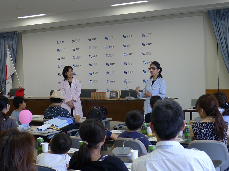 8月7日(水)、8日(木)の2日間、こども霞が関見学デーが開催されました。このイベントは、親子のふれあいを深め、子どもたちが夏休みに広く社会を知る体験活動の機会とするとともに、政府の施策に対する理解を深めてもらうことを目的に、文部科学省を中心に各府省庁などが参加して実施しています。金融庁では、お金の役割や大切さを子供たちにわかりやすく実感してもらうための金融教育講座「親子で学ぶ!マネー教室」を開催し、ファイナンシャルプランナーのキャサリン(竹内かおりさん)とナンシー(西岡奈美さん)が、「お金とは何か?」や、銀行に預けたお年玉を題材に「直接金融と間接金融」について講演したほか、大臣室の見学や一億円分の紙幣の重さ体験を行いました。