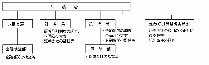 ホーム 金融庁について 金融庁の概要 金融行政機構の推移 Tweet 金融行政機構の推移 【平成4年7月から平成10年6月】 【平成10年6月から平成10年12月】 【平成10年12月から平成12年6月】 【平成12年7月から平成13年1月】 【平成13年1月から平成16年3月】 【現 行】 サイトマップ 金融庁についてページ一覧を開きます 組織 大臣・副大臣・政務官 金融庁の概要 金融庁の改革 所管の法人 予算・決算 政策評価 採用情報 報道・広報ページ一覧を開きます 報道対応 報道発表資料 記者会見 大臣談話等 広報活動 アクセスFSA(広報誌) 白書・年次報告 職員による講演等 職員による寄稿等 利用者の方へ 注意喚起情報 業界団体との意見交換会において金融庁が提起した主な論点 よく閲覧されているページ 政策・審議会ページ一覧を開きます 基本方針等 金融行政方針 政府方針における金融庁関連の施策 政策テーマ・施策 政策テーマ等一覧(金融行政方針との関連) 政策テーマ等一覧(全体) 審議会・研究会等 審議会・研究会等一覧 研究・調査 金融研究センター 法令・指針等ページ一覧を開きます 所管法令等 検査・監督の基本方針等 基本方針・ディスカッションペーパー一覧 監督指針・事務ガイドライン 監督指針一覧 事務ガイドライン(第三分冊:金融会社関係)一覧 告示・ガイドライン・Q&A等 告示・ガイドライン・Q&A・法令解釈事例集一覧 金融上の行政処分等 金融機関情報ページ一覧を開きます 全金融機関共通 預金取扱金融機関(銀行等)関連 保険会社関連 金融商品取引業者等関連 金融会社関連 国際関係情報ページ一覧を開きます 国際関係の取組み 国際金融センター 金融庁グローバル金融連携センター(GLOPAC) 監査監督機関国際フォーラム(IFIAR)事務局への活動支援 国際基準設定主体等の公表資料等 金融安定理事会(FSB) バーゼル銀行監督委員会(BCBS) 保険監督者国際機構(IAIS) 証券監督者国際機構(IOSCO) 金融活動作業部会(FATF) その他 アクセスFSA(広報誌) ページの先頭に戻る