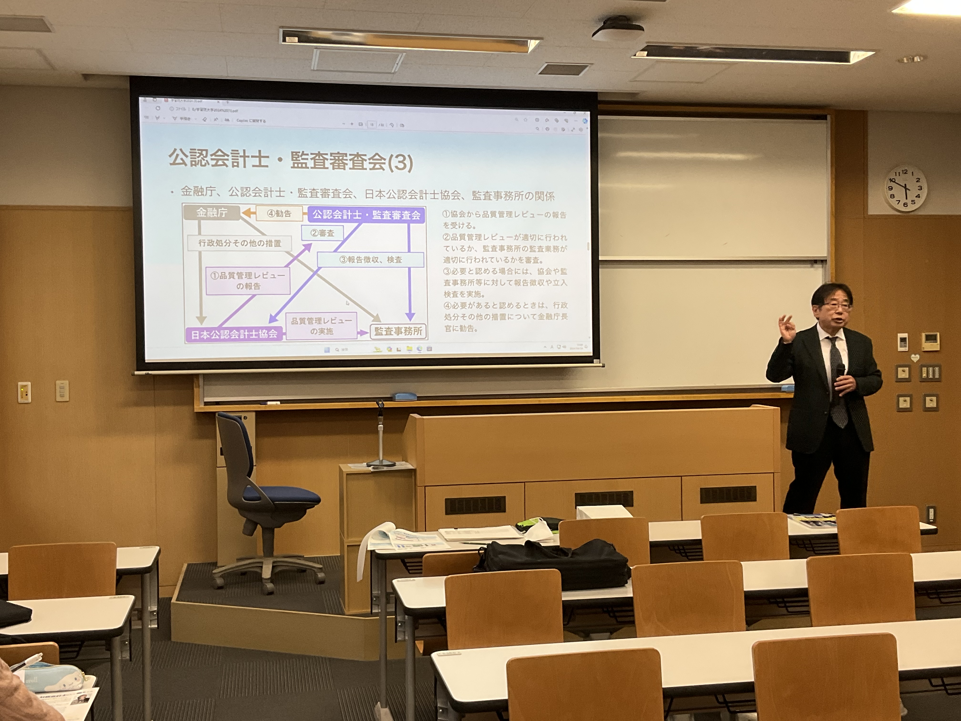 トップページ その他の情報 講演・寄稿等 令和6年の講演会等 講演等 学習院大学講演 令和6年4月24日、学習院大学において、青木委員が「公認会計士という職業の魅力」をテーマとして講演を行い、多数の学生の皆さまに御出席いただきました。 【講演資料】(PDF:3,774KB) サイトマップ 公認会計士・監査審査会ページ一覧を開きます 審査会について パンフレット 年次報告 審査会の開催状況 品質管理レビューの審査・検査ページ一覧を開きます 基本方針・基本計画等 検査結果等の取りまとめ 勧告 公認会計士試験ページ一覧を開きます 試験実施情報 令和8年試験について 令和7年試験について 過去の試験結果等 試験のバランス調整について 公認会計士試験Q&A 申請書様式等 公認会計士試験合格者等の方へ 公共サービス改革基本方針に基づく民間競争入札 その他の情報ページ一覧を開きます 国際関係 講演・寄稿等 パブリックコメント 公認会計士・監査審査会発足以前の情報 リンク集 採用情報ページ一覧を開きます 採用情報 審査検査課長からのメッセージ(PDF) 検査官からのメッセージ(1)(PDF) 検査官からのメッセージ(2)(PDF) Q&A(PDF) 情報公開等ページ一覧を開きます 情報公開 個人情報保護 ページの先頭に戻る