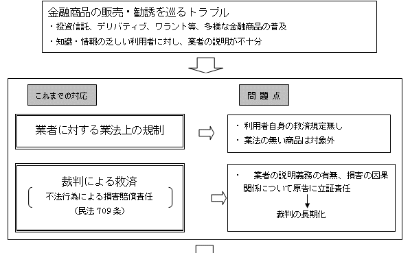 金融商品は、その危険性が顧客にとって一見して分からないため、説明が不十分であったことを理由とした紛争が少なくありません。しかし、銀行法、保険業法、証券取引法等の各種の業法に規定されているさまざまな情報提供義務に関する規定に違反したとしても、直ちに損害賠償責任が生ずるわけではなく、業者の説明不足が不法行為と認定され損害賠償が認められるには、裁判において個々のケースごとに説明義務の存否を争う必要があり、これに伴う裁判の長期化が原告顧客側に大きな負担となっています。このため、予見性の高いルールとして、損害賠償が認められる前提となる説明義務を類型化して明示すべきとの強い要請があります。
