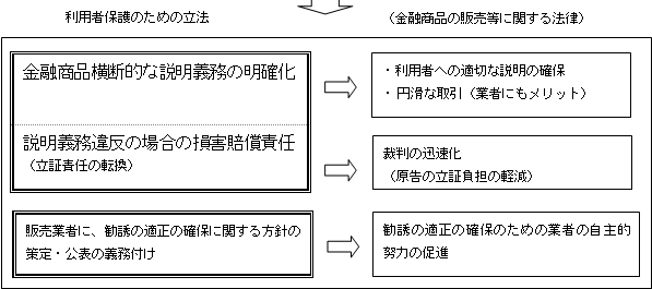 この法律は、金融商品販売業者等が金融商品の販売等に際し顧客に対して説明すべき事項及び金融商品販売業者等が顧客に対して当該事項について説明をしなかったことにより当該顧客に損害が生じた場合における金融商品販売業者等の損害賠償の責任並びに金融商品販売業者等が行う金融商品の販売等に係る勧誘の適正の確保のための措置について定めることにより、顧客の保護を図り、もって国民経済の健全な発展に資することを目的とすることとする。 (第1条関係)