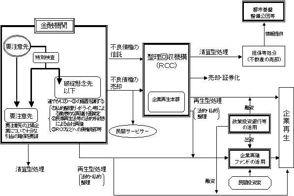 預金保険機構・RCCは、不良債権の買取りについて、価格決定方式を弾力化(時価による買取り)するとともに、入札への参加を可能とした上、15年度末までに集中的に実施する。また、預金保険機構・RCCは、買い取った不良債権の処分の多様化に努め、経済情勢、債務者の状況等を考慮し、当該試算の買取りから可能な限り3年を目途として早期処理を行うよう努める。本年11月1日にRCCに企業再生本部を設置し、再生の可能性のある債務者の速やかな再生に努めるなど企業再建に積極的に取り組む。