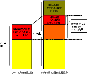 | <特別検査の結果を踏まえた各行の対応> 特別検査の結果、債務者区分が破綻懸念先とされた債務者は、昨年10月の「改革先行プログラム」において、(a)私的整理ガイドライン等による徹底的な再建計画策定、(b)民事再生法等の法的手続きによる会社再建、(c)RCC(整理回収機構)などへの債権売却等、のいずれかの措置を講ずることが求められており、これに沿った対応が行われます。既に、債務者との間で金融支援策が盛り込まれた経営改善計画について合意するなどの対応がなされています。 (主要行の14年3月期の財務内容の概要について) 次に、特別検査の結果公表に合わせて主要行が公表した14年3月期の主な財務内容の概要をみますと、特別検査等を踏まえた結果、不良債権処分損は約7.8兆円と、昨年11月時点の業績予想約6.4兆円と比べると、約1.4兆円の増加(21%増)となっています。これは、特別検査による債務者区分の下位変更のほかに、特別検査を踏まえた自己査定の厳格化(特別検査対象債務者の準メイン行等)、特別検査対象外の債務者の業況悪化などの要因によるものと考えられます。また、自己資本比率は、国際基準行については 8%、国際基準行については4%を大きく上回る水準となる見通しです。 なお、特別検査の結果による不良債権処分損が1.9兆円であるのに、財務内容の公表概要での同処分損は、昨年11月時点の見込みに比べて1.4兆円の増加にとどまっています。これは、下の図にも示した通り、各行が、特別検査の実施を踏まえ、既に昨年11月時点で自主的にその影響を織り込んでいたためです。 不良債権処分損の見込額の推移 |