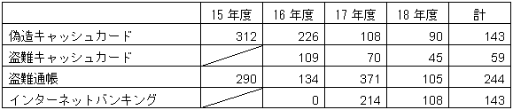 | (注1) | 偽造キャッシュカード被害発生件数及び平均被害額の合計には、12年度(1件)及び14年度(8件)の件数・金額を含む。 |