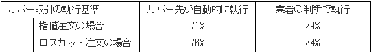 顧客から受けた指値・ロスカット注文(注2)の執行に係るカバー取引の執行基準としては、業者の判断によらずカバー取引先が自動的に行うものと、業者が相場の気配等から独自に判断して行うものがあります。