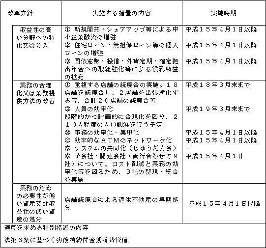 株式会社関東銀行及び株式会社つくば銀行から提出された「経営基盤強化計画」について金融機関等の組織再編成の促進に関する特別措置法(以下「法」)に基づき審査した結果、認定要件に適合するものと認められるため、平成15年3月31日付で経営基盤強化計画の認定を行った。