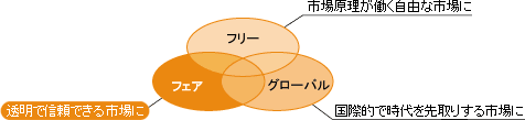 ●わが国の金融市場を再生させるために、政府は1フリー(市場原理が働く自由な市場に)、2フェア(透明で信頼できる市場に)、3グローバル(国際的で時代を先取りした市場に)の3原則を柱とした金融システム改革(いわゆる日本版ビッグバン)を進めています。