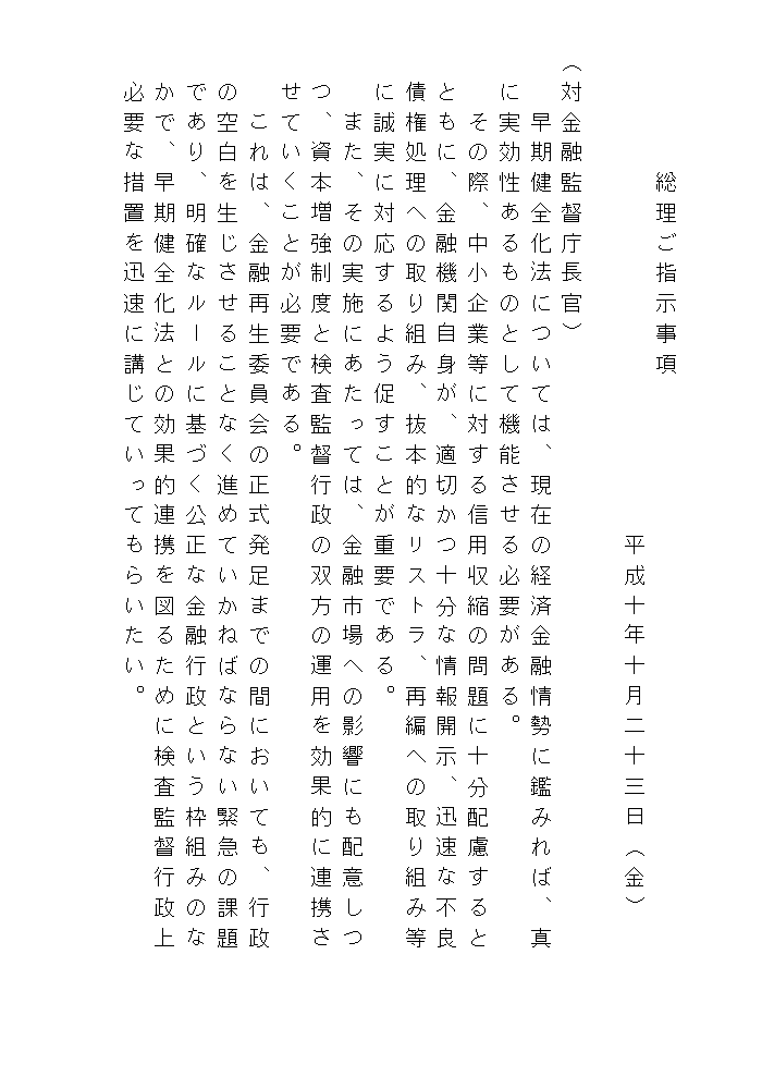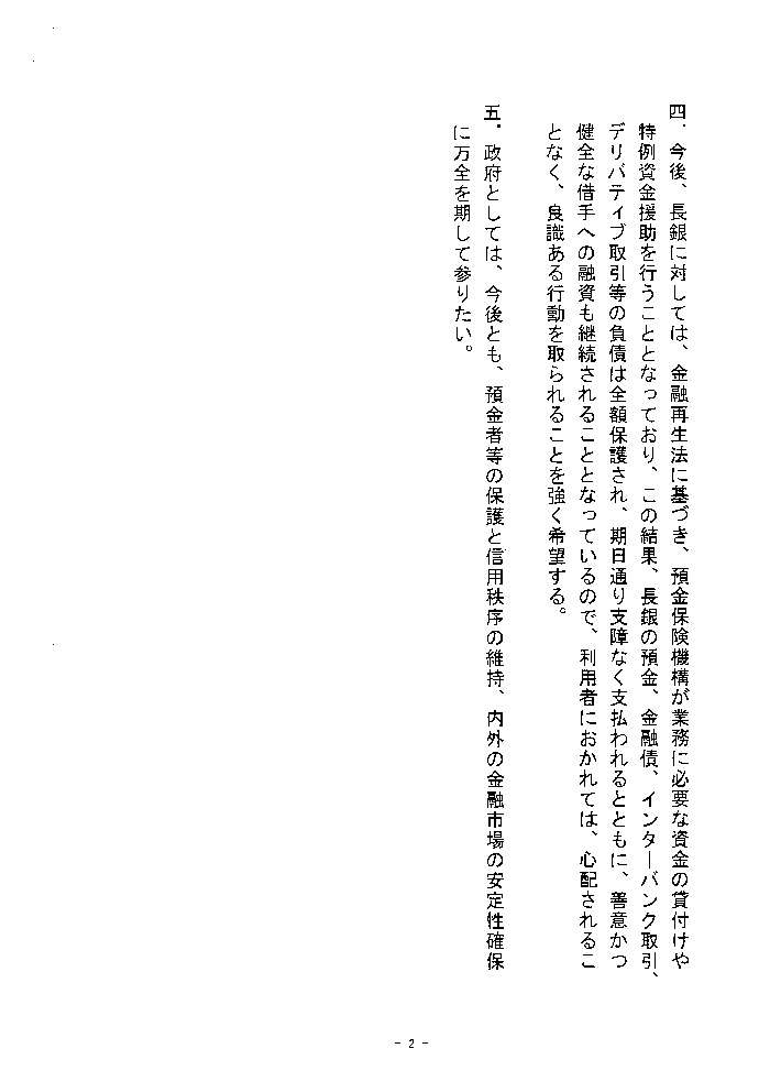 平成10年10月23日 金 融 監 督 庁 長 官 談 話 1(1) 本日、日本長期信用銀行から内閣総理大臣に対して「金融機能の再生のための緊急 措置に関する法律」(金融再生法)に基づく申出があり、これを踏まえ、内閣総理大 臣は同法に基づく特別公的管理の開始の決定等を行った。 (2) 長銀の業務運営については今後も従前通り行われることになるが、資産劣化防止の 観点から、長銀から内閣総理大臣への申出と同時に、当庁より同行に対し、銀行法第 26条に基づく業務改善命令を発した。長銀においては、この命令を踏まえ、適切な 業務運営を行っていくことが求められる。 (3) さらに、当庁としては、今般の長銀に関する決定の内容等が、内外の市場関係者に 正確に理解されるよう、大蔵省、日本銀行とも協力して、海外の関係当局に十分な説 明を行うなどの努力を行っていきたいと考えている。 2(1) また、本日、「金融機能の早期健全化のための緊急措置に関する法律」(早期健全 化法)が施行された。これを受け、内閣総理大臣から、同法を真に実効性のあるもの として機能させるために、明確なルールに基づく公正な金融行政という枠組みのなか で、早期健全化法との効果的連携を図るために検査監督上必要な措置を迅速に講じる ようにとのご指示を頂いた。 (2) 当庁としては、この内閣総理大臣のご指示を踏まえ、我が国金融システムの早期健 全化のため、検査、モニタリングの強化と早期是正措置の厳正な運用などの監督権限 の適切な行使を通じ、個々の金融機関の経営の健全化を図り、もって預金者等の保護 と信用秩序の維持、内外の金融市場の安定性確保に万全を期して参りたい。