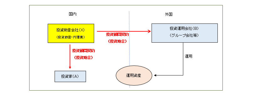 国内に拠点を置く投資運用会社(X)が、国内の投資家(A)と投資一任契約を締結し、当該投資一任契約に基づき投資家(A)の資産を運用する場合で、その運用権限を外国に拠点を置くグループ会社である投資運用会社(B)へ再委託する場合。