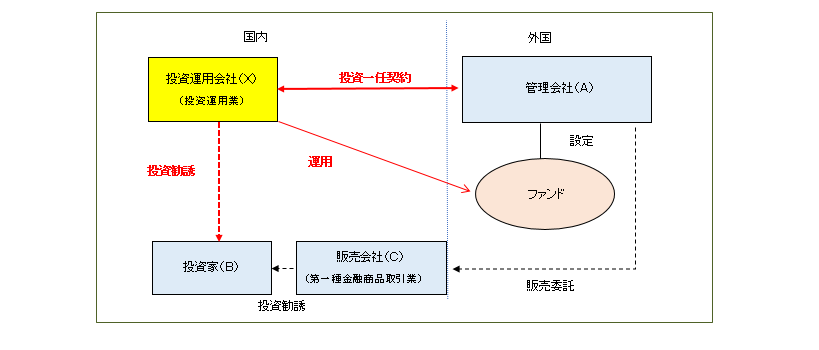 国内に拠点を置く投資運用会社(X)が、国内において投資信託を設定・運用するとともに、自ら設定した当該投資信託への投資を投資家(A)に勧誘する場合。