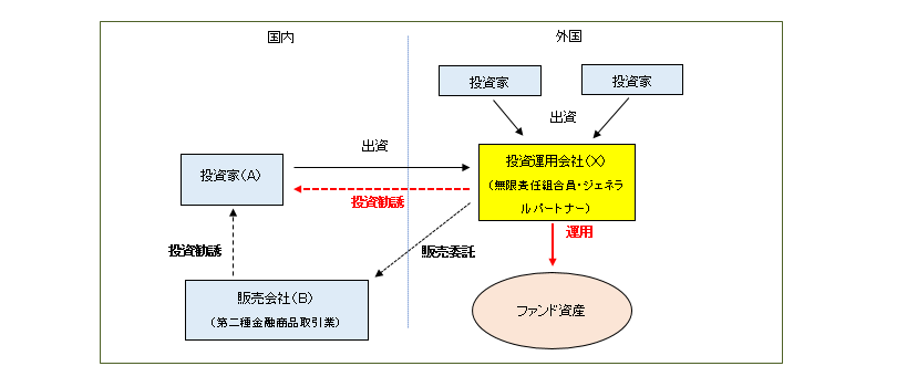 国内に拠点を置く投資運用会社(X)が、国内において、組合型ファンドを組成し、その投資家(A)から出資を受けた金銭を運用(自己運用)するとともに、自ら当該ファンド持分を投資家(A)に勧誘する場合。