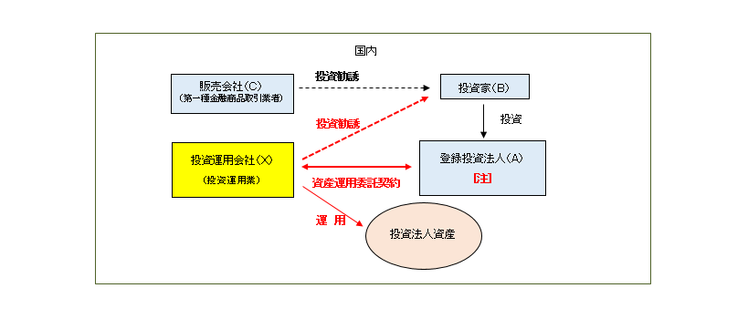 国内に拠点を置く投資運用会社(X)が、投信法に基づき設立された国内の登録投資法人(A)との間で資産運用委託契約を締結し、同契約に基づき登録投資法人(A)の保有資産の運用を行うとともに、自ら登録投資法人(A)の発行する投資証券等を投資家(B)に投資勧誘する場合。
