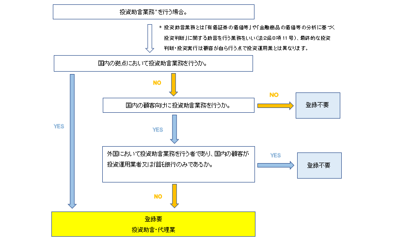 国内に拠点を置く投資助言会社が、国内又は外国の顧客に対して、投資顧問契約に基づき、有価証券の価値等や金融商品の価値等の分析に基づく投資判断に関し助言を行う場合