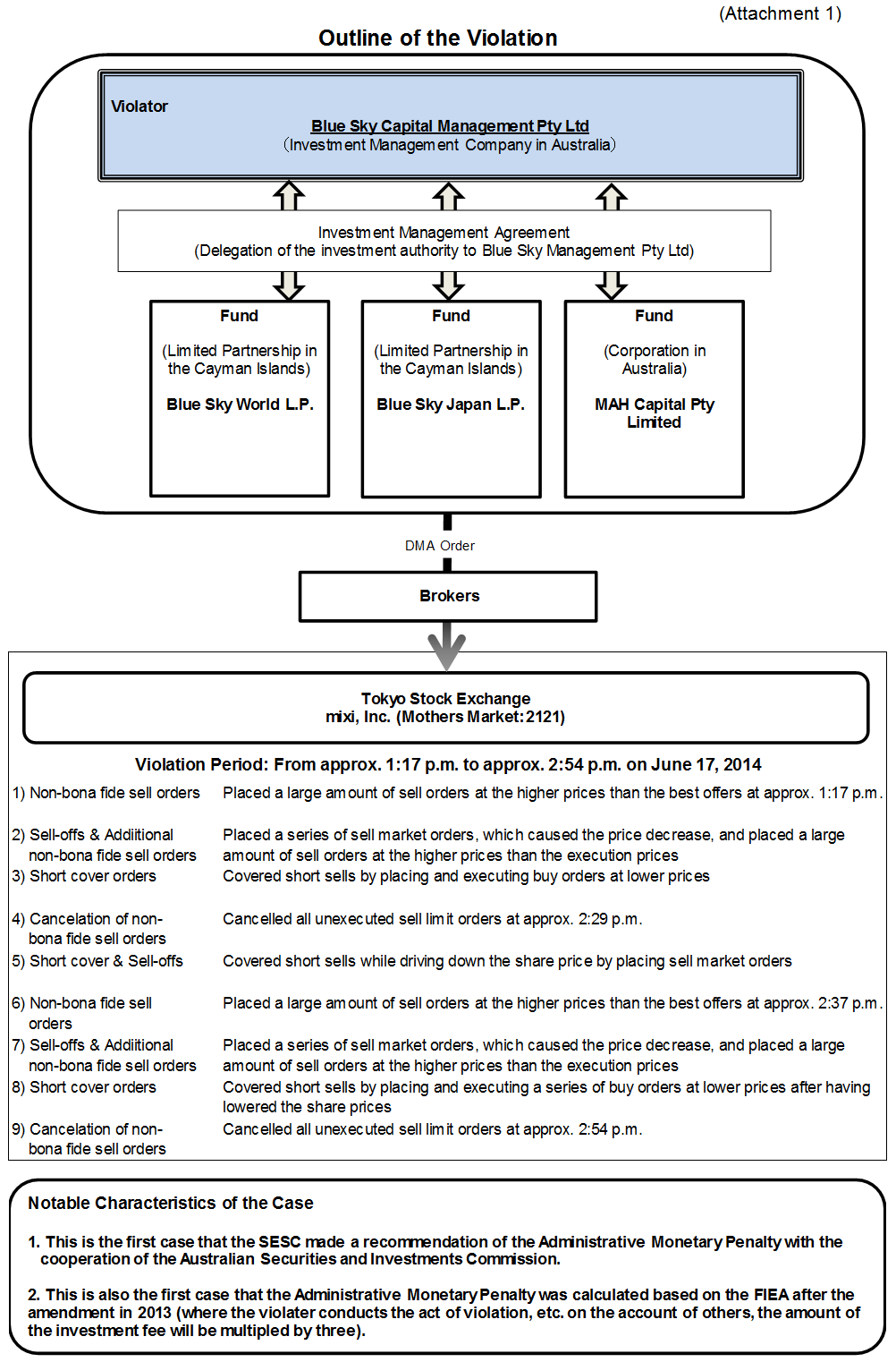 Blue Sky is a proprietary company whose principal place of business is located in New South Wales, Australia. Pursuant to the investment management agreements entered into with relevant parties such as the general partner, Blue Sky has the authority to manage the assets invested in three funds: Blue Sky World L.P. and Blue Sky Japan L.P., both of which were formed in the Cayman Islands as a limited partnership, and MAH Capital Pty Limited, which was incorporated in Australia as a corporation. Blue Sky, through a person who engaged in securities trading, in relation to its business, as described in the Appendix, regarding shares of mixi, Inc., whose shares are listed on the Tokyo Stock Exchange Mothers Market, from 1:17:03 p.m. to 2:54:16 p.m. on June 17, 2014, with the purpose of inducing sales and purchases of other market participants, conducted transactions including the following: (i) decreasing prices by placing a series of large amounts of market sell orders and (ii) without intention to execute, placing a large amount of sell orders at prices above the best offers on the Tokyo Stock Exchange. Thus, in total, Blue Sky sold 166,300 shares and purchased 98,300 shares while placing sell orders (unexecuted) for 773,300 shares and purchase orders (unexecuted) for 18,800 shares on the accounts of the others. These constituted a series of sale and purchase and entrustments of securities that would mislead others into believing that sale and purchase of the shares were thriving and would cause fluctuations in the market of the shares.