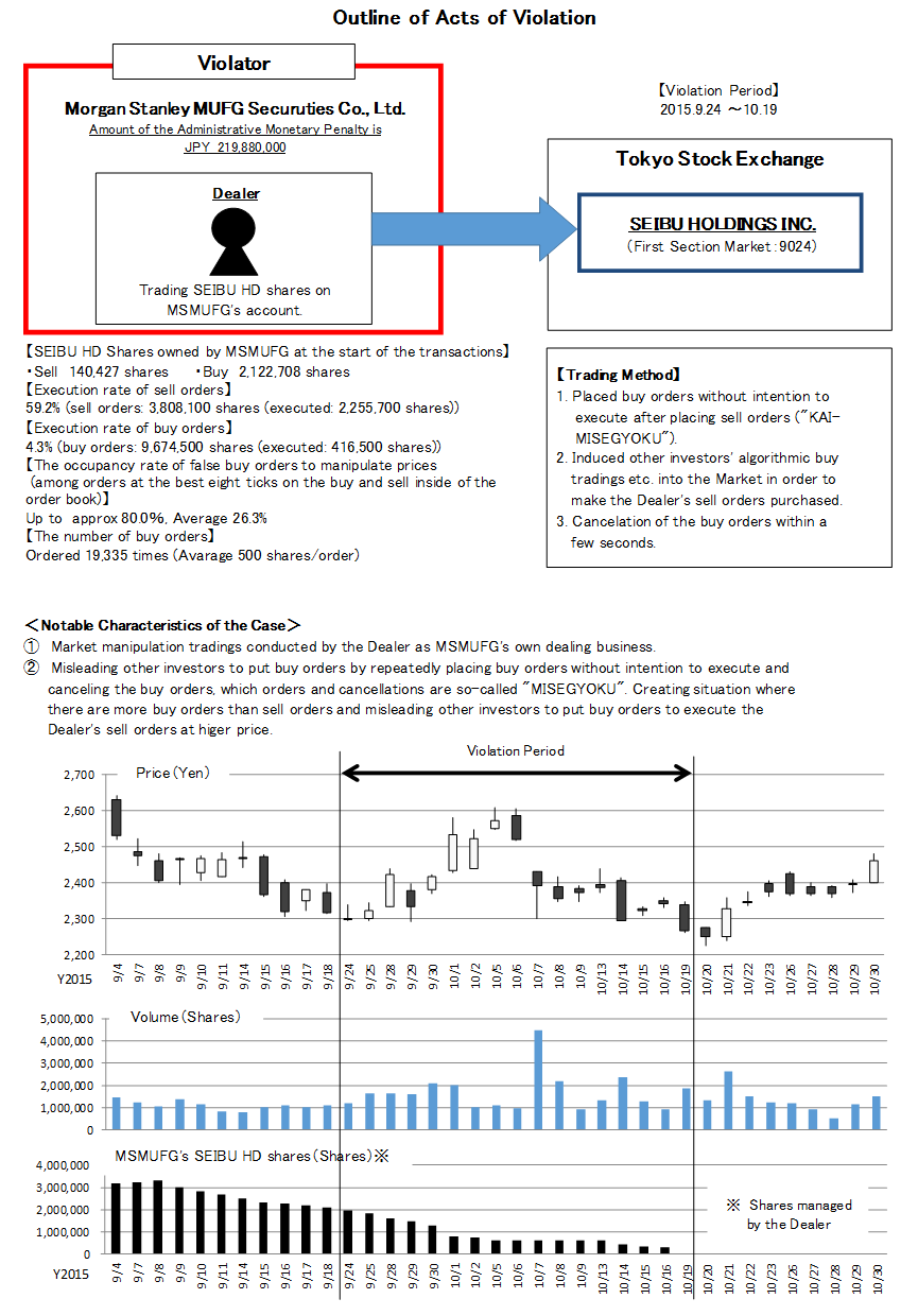 MSMUFG is a stock company which is registered with the commissioner of Kanto finance bureau as a Type I Financial Instruments Business Operator. MSMUFG, through an employee who engaged in securities trading, in relation to its business, regarding shares of SEIBU HOLDINGS INC., whose shares are listed on the Tokyo Stock Exchange First Section Market, during 14 trade days in total from September 24 to October 6 and from October 13 to October 19, 2015, with the purpose of inducing sales and purchases of other market participants, conducted transactions including, without intention to execute, placing a large amount of buy orders at prices around the best offers on the Tokyo Stock Exchange. Thus, in total, MSMUFG bought 416,500 shares while placing purchase orders for 9,258,000 shares on its own account. These constituted a series of sales and purchases and their offers of securities that would mislead others into believing that sales and purchases of the shares were thriving and would cause fluctuations in the market of the shares.