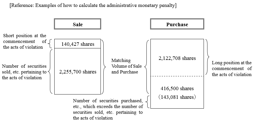 (2)The amount of the administrative monetary penalty regarding the excess transaction volume (143,081 shares) where the amount pertaining to the purchase, etc. of the securities exceeds the amount pertaining to the sale, etc. of the securities as described in (1) above is 48,461,790 yen (Note 4).