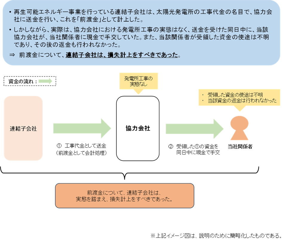 当社の連結子会社は、実態のない前渡金の計上による損失の不計上の不適正な会計処理を行いました。