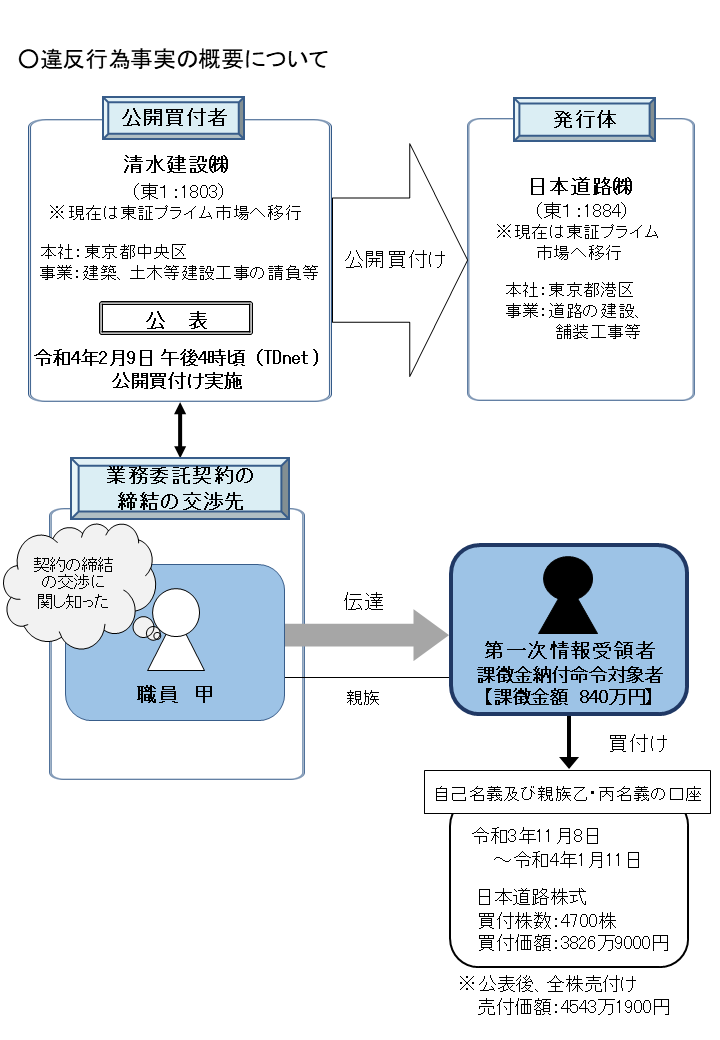 - 公開買付者との契約締結交渉者の職員から伝達を受けた者による日本道路株式に係る内部者取引に対する課徴金納付命令の勧告について