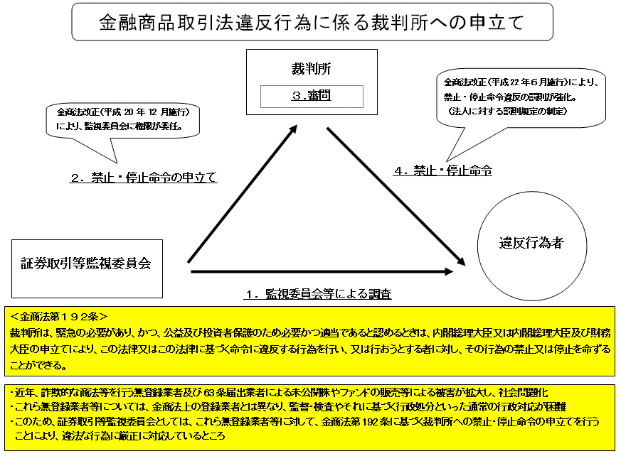 第百九十二条 裁判所は、緊急の必要があり、かつ、公益及び投資者保護のため必要かつ適当であると認めるときは、内閣総理大臣又は内閣総理大臣及び財務大臣の申立てにより、この法律又はこの法律に基づく命令に違反する行為を行い、又は行おうとする者に対し、その行為の禁止又は停止を命ずることができる。