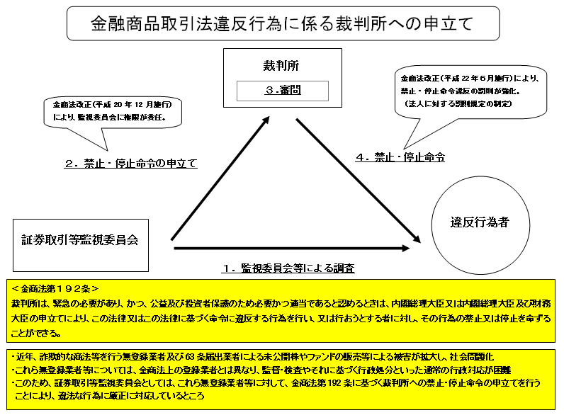 第百九十二条 裁判所は、緊急の必要があり、かつ、公益及び投資者保護のため必要かつ適当であると認めるときは、内閣総理大臣又は内閣総理大臣及び財務大臣の申立てにより、この法律又はこの法律に基づく命令に違反する行為を行い、又は行おうとする者に対し、その行為の禁止又は停止を命ずることができる。