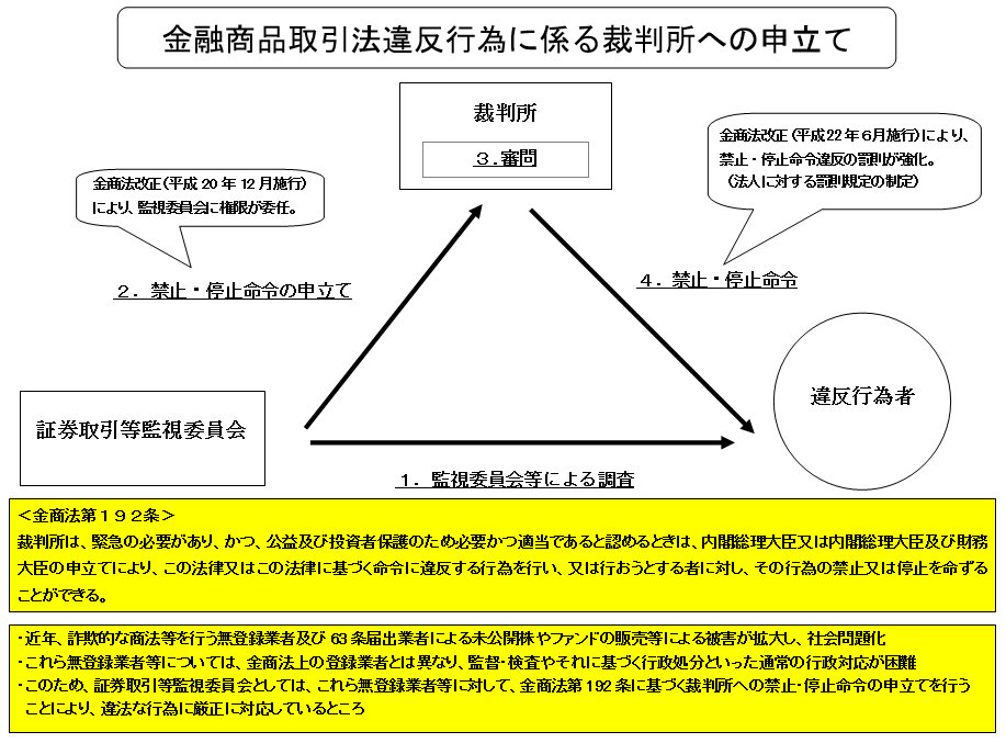 第百九十二条 裁判所は、緊急の必要があり、かつ、公益及び投資者保護のため必要かつ適当であると認めるときは、内閣総理大臣又は内閣総理大臣及び財務大臣の申立てにより、この法律又はこの法律に基づく命令に違反する行為を行い、又は行おうとする者に対し、その行為の禁止又は停止を命ずることができる。