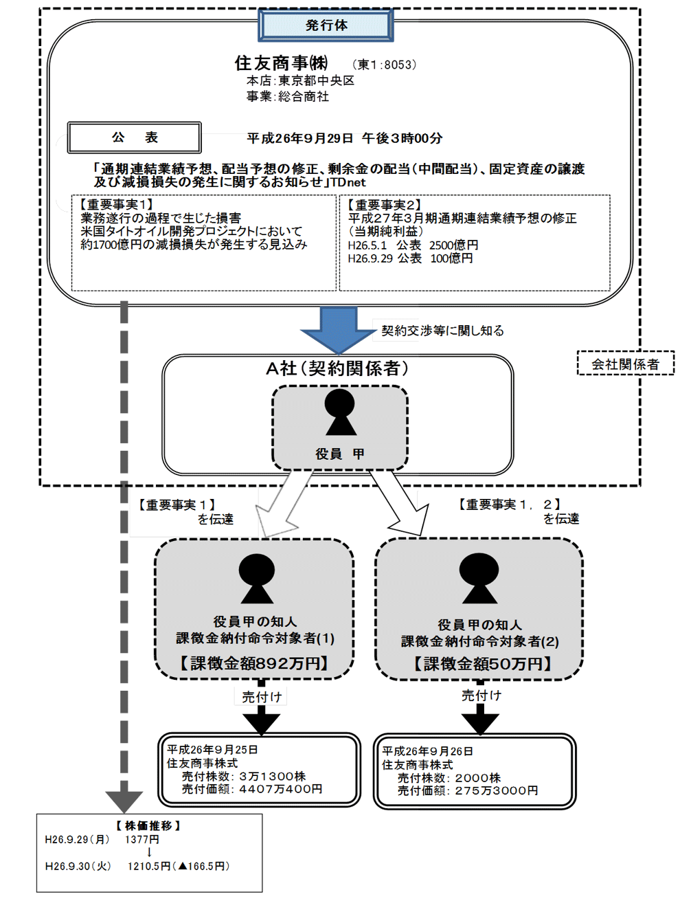 それぞれ受けながら、上記各事実の公表がされた平成26年9月29日より前の同月26日、自己の計算において、住友商事株式合計2000株を売付価額合計275万3000円で売り付けたものである。