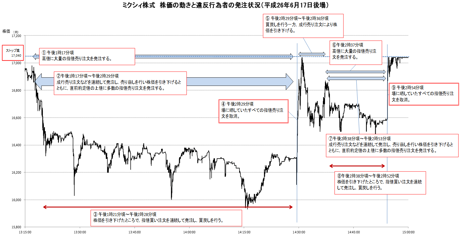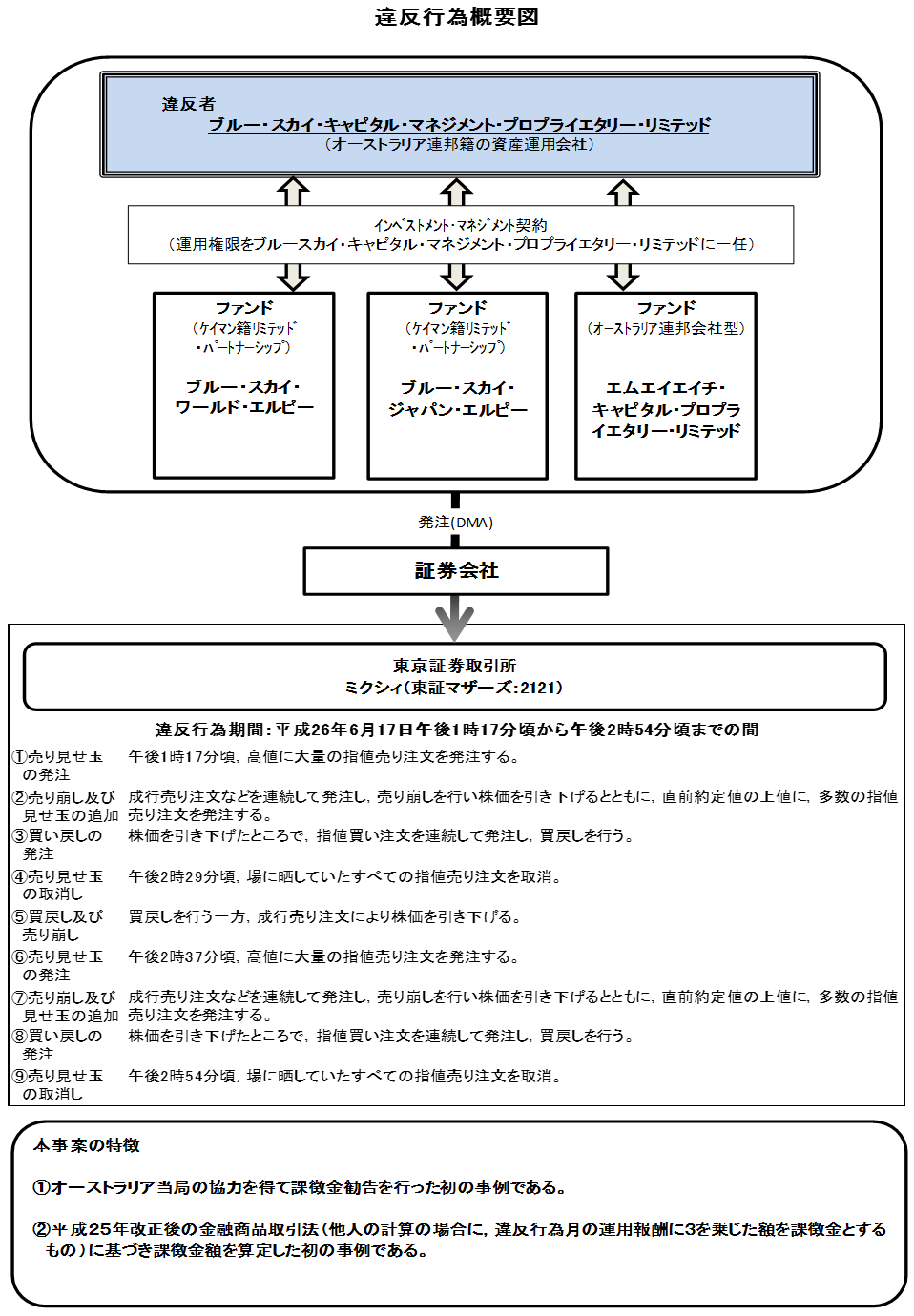 ブルースカイは、オーストラリア連邦ニューサウスウェールズ州に本店を置く会社であり、英国領ケイマン諸島(以下「ケイマン」という。)籍リミテッドパートナーシップ形態のファンドであるブルー・スカイ・ワールド・エルピー及びブルー・スカイ・ジャパン・エルピーの各ジェネラルパートナーとの間で締結したインベストメント・マネジメント契約並びにオーストラリア連邦籍の会社形態のファンドであるエムエイエイチ・キャピタル・プロプライエタリー・リミテッドとの間で締結したインベストメント・マネジメント契約に基づき、上記3つのファンドに出資された資産の運用権限を有していたものであるが、ブルースカイの役職員において、同社の業務に関し、東京証券取引所マザーズ市場に上場されている株式会社ミクシィの株式につき、同株式の売買を誘引する目的をもって、別表記載のとおり、平成26年6月17日午後1時17分03秒から同日午後2時54分16秒までの間、株式会社東京証券取引所において、大量の成行売り注文を連続して発注して株価を引き下げたり、上値に約定させる意思のない大量の売り注文を発注するなどの方法により、同株式合計16万6300株を売り付ける一方、同株式合計9万8300株を買い付けるとともに、同株式合計77万3300株の売付けの委託及び同株式合計1万8800株の買付けの委託を行い、もって、自己以外の者の計算において、同株式の売買が繁盛であると誤解させ、かつ、同市場における同株式の相場を変動させるべき一連の売買及び委託をしたものである。