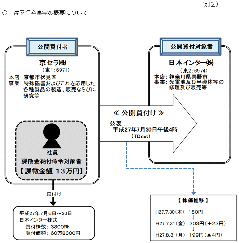課徴金納付命令対象者は、京セラ株式会社(以下「京セラ」という。)の社員であったが、京セラの業務執行を決定する機関が、日本インター株式会社(以下「日本インター」という。)の株式の公開買付けを行うことについての決定をした旨の公開買付けの実施に関する事実を知りながら、上記事実の公表がされた平成27年7月30日午後4時頃より前の同年7月6日から同年7月30日午後2時13分頃までの間、自己の計算において、日本インター株式合計3300株を買付価額合計60万8300円で買い付けたものである。