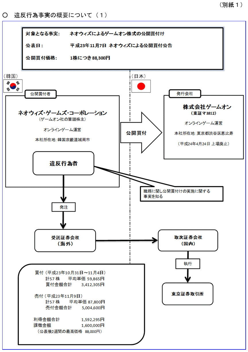 課徴金納付命令対象者(大韓民国に居住)は、大韓民国に本社を置くネオウィズ・ゲームズ・コーポレーションの従業員であったが、その職務に関し、同社の業務執行を決定する機関がゲームオン株式の公開買付けを行うことについての決定をした旨の公開買付けの実施に関する事実を知りながら、当該事実の公表前の平成23年10月31日から同年11月4日までの間、自己の計算において、ゲームオン株式合計57株を買付価額合計341万2305円で買い付けたものである。