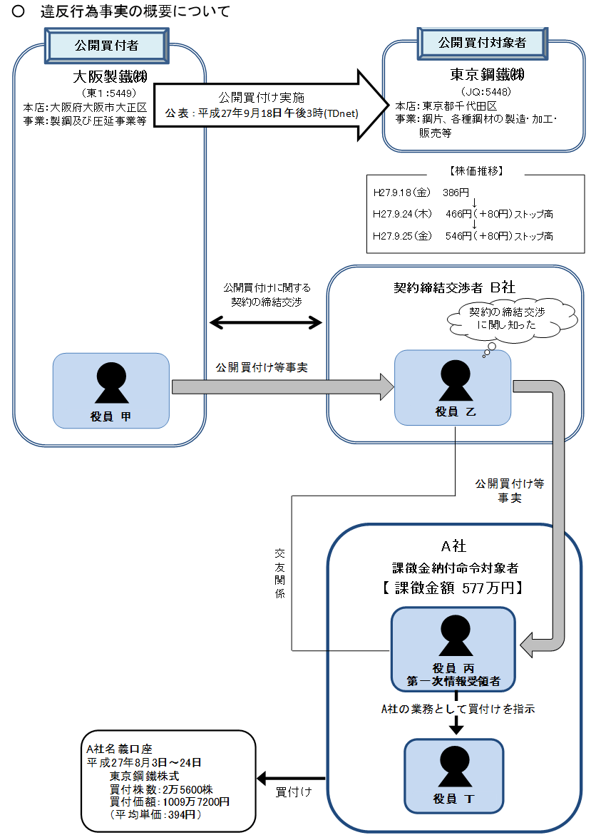 課徴金納付命令対象者(A社)は、同社役員において、大阪製鐵株式会社(以下「大阪製鐵」という。)と公開買付けに関する契約の締結交渉をしていた、B社の役員から、同人がその契約の締結交渉に関し知った、大阪製鐵の業務執行を決定する機関が、東京鋼鐵株式会社(以下「東京鋼鐵」という。平成28年7月14日上場廃止。)の株式の公開買付けを行うことについての決定をした旨の公開買付けの実施に関する事実の伝達を受けながら、同社の業務として、上記事実の公表がされた平成27年9月18日より前の同年8月3日から同月24日までの間、自己の計算において、東京鋼鐵株式合計2万5600株を買付価額合計1009万7200円で買い付けたものである。