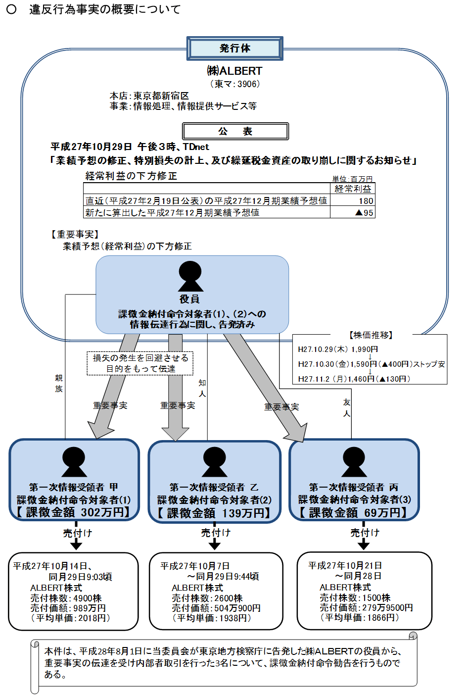 課徴金納付命令対象者(1)は、株式会社ALBERT(以下「アルベルト」という。)の役員であった者から、同人がその職務に関し知った、同社が新たに算出した平成27年1月1日から同年12月31日までの会計期間における同社の経常利益の予想値について、同年2月19日に公表がされた直近の予想値(経常利益1億8000万円)に比較して、黒字から赤字に転じる見込みであり、投資者の投資判断に及ぼす影響が重要なものとなる差異が生じた旨の重要事実の伝達を受けながら、同重要事実の公表がされた平成27年10月29日午後3時頃より前の同月14日及び同月29日午前9時3分頃、自己の計算において、アルベルト株式合計4900株を売付価額合計989万円で売り付けたものである。