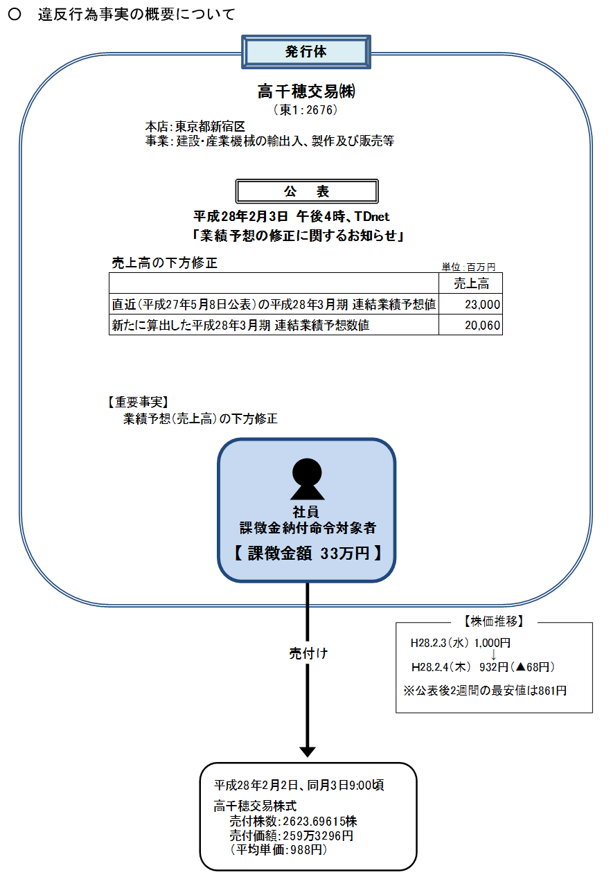 課徴金納付命令対象者は、高千穂交易株式会社(以下「高千穂交易」という。)に勤務していた者であるが、同人がその職務に関し、同社の属する企業集団の平成27年4月1日から平成28年3月31日までの会計期間(平成28年3月期)の業績予想数値における売上高について、平成27年5月8日に公表がされた直近の予想値(売上高230億円)に比較して、同社が新たに算出した予想値において、投資者の投資判断に及ぼす影響が重要なものとなる差異が生じた旨の重要事実を知りながら、同社において新たに算出した平成28年3月期の予想値(売上高200億6000万円)の公表がされた平成28年2月3日午後4時頃より前の同月2日及び同月3日午前9時頃、自己の計算において、高千穂交易株式合計2623.69615株を売付価額合計259万3296円で売り付けたものである。