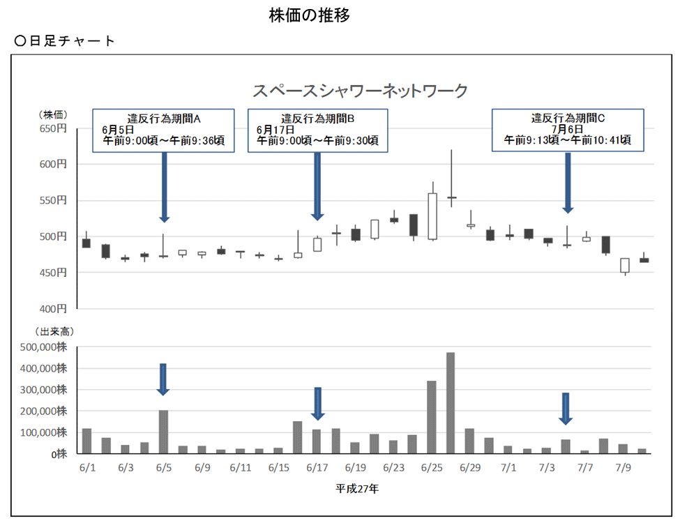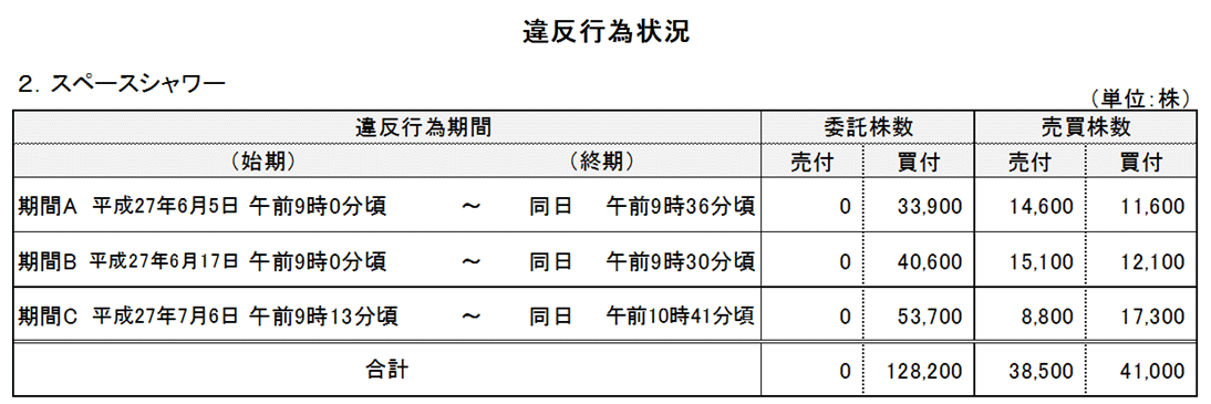 (2)株式会社スペースシャワーネットワーク(以下「スペースシャワー」という。)の株式につき、同年6月5日午前9時0分頃から同日午前9時36分頃までの間、同月17日午前9時0分頃から同日午前9時30分頃までの間及び同年7月6日午前9時13分頃から同日午前10時41分頃までの間、前記同様の方法により、同株式合計12万8200株の買付けの委託を行うとともに、同株式合計4万1000株を買い付ける一方、同株式合計3万8500株を売り付け、