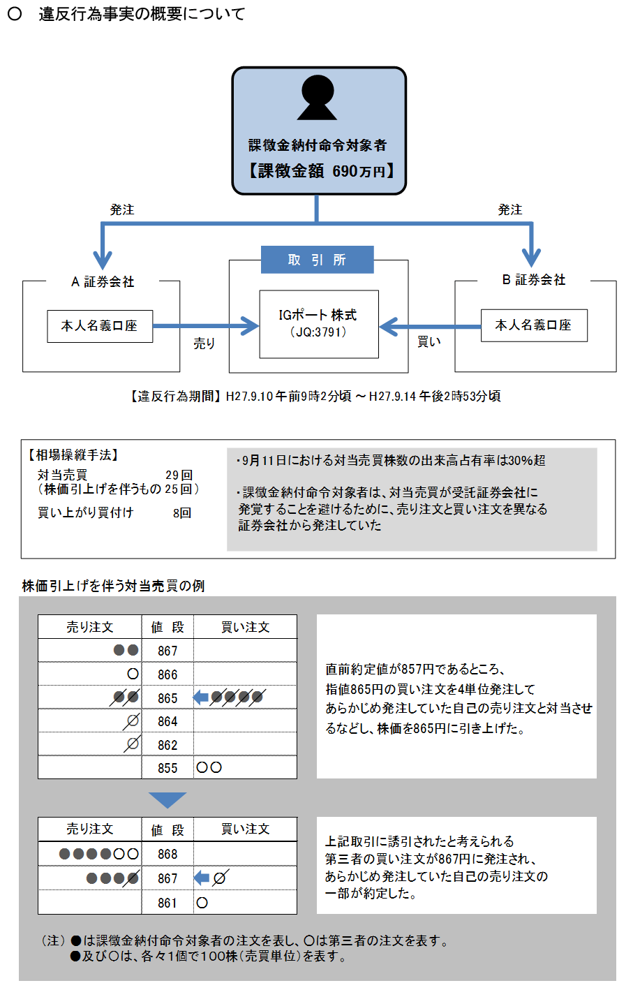 課徴金納付命令対象者は、株式の売買を誘引する目的をもって、株式会社IGポートの株式につき、平成27年9月10日午前9時2分頃から同月14日午後2時53分頃までの間、3取引日において、直前の約定値より高指値の売り注文と買い注文を対当させて株価を引き上げたり、直前の約定値より高指値の買い注文を連続して発注して株価を引き上げるなどの方法により、同株式合計8600株を買い付ける一方、同株式合計1万5600株を売り付け、もって、自己の計算において、同株式の売買が繁盛であると誤解させ、かつ、同市場における同株式の相場を変動させるべき一連の売買をしたものである。