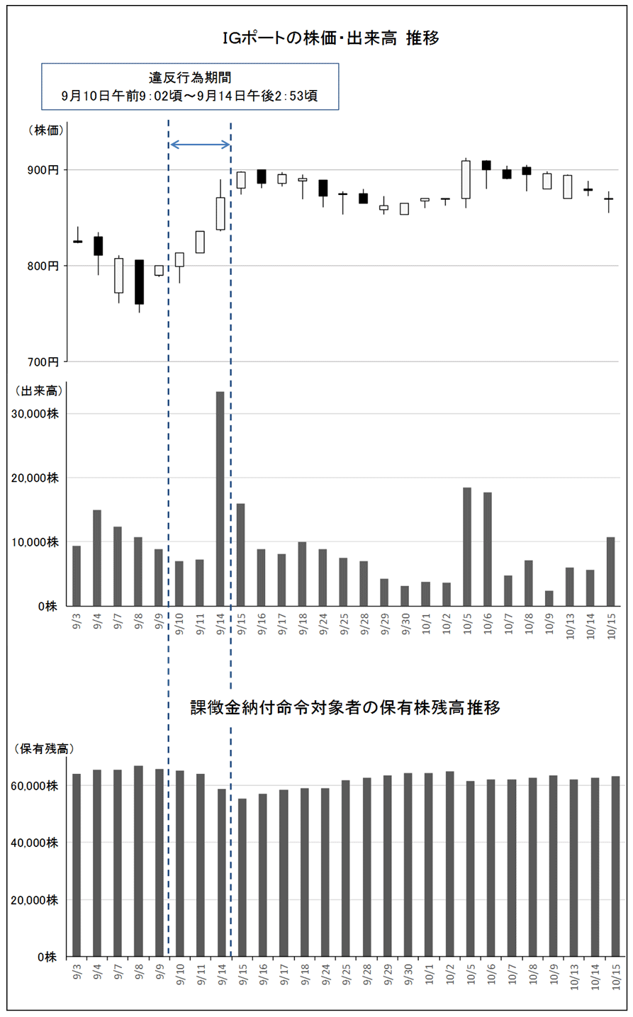証券取引等監視委員会は、IGポート株式に係る相場操縦について検査した結果、下記のとおり法令違反の事実が認められたので、本日、内閣総理大臣及び金融庁長官に対して、金融庁設置法第20条第1項の規定に基づき、課徴金納付命令を発出するよう勧告を行った。