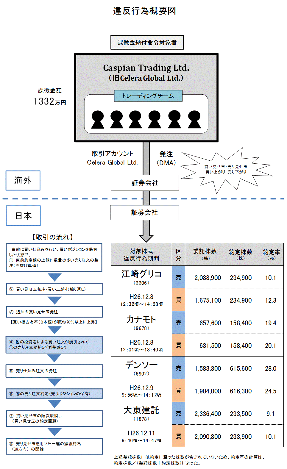 証券取引等監視委員会は、Caspian Trading Ltd.(旧Celera Global Ltd.)(以下「セレラ」という。)による相場操縦について検査した結果、下記のとおり法令違反の事実が認められたので、本日、内閣総理大臣及び金融庁長官に対して、金融庁設置法第20条第1項の規定に基づき、課徴金納付命令を発出するよう勧告を行った。