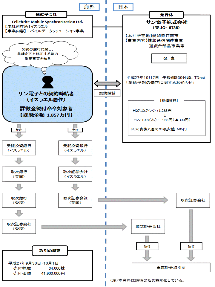 課徴金納付命令対象者(イスラエル国に居住)は、サン電子との間で契約を締結していた者であるが、同契約の履行に関し、同社の属する企業集団の平成27年4月1日から平成28年3月31日までの事業年度(平成28年3月期)の経常利益及び親会社株主に帰属する当期純利益の予想値について、平成27年5月15日に公表された直近の予想値(経常利益27億円、親会社株主に帰属する当期純利益20億円)に比較して、同社が新たに算出した予想値において、投資者の投資判断に及ぼす影響が重要なものとなる差異が生じた旨の重要事実を知りながら、同社において新たに算出した平成28年3月期の予想値(経常利益4億円、親会社株主に帰属する当期純利益4億円)の公表がされた平成27年10月7日午後6時30分頃より前の同年9月30日及び同年10月1日、自己の計算において、サン電子株式合計3万4千株を売付価額合計4,190万円で売り付けたものである。