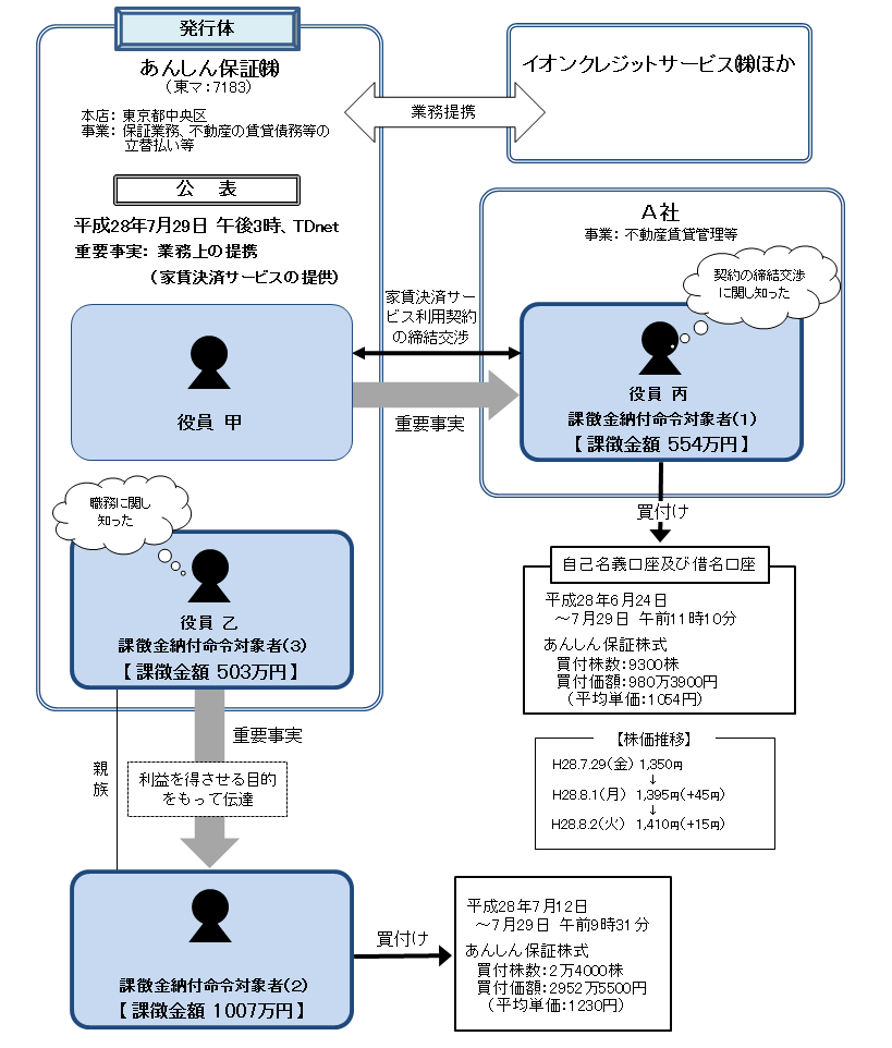 課徴金納付命令対象者(2)は、あんしん保証の役員である課徴金納付命令対象者(3)から、同人がその職務に関し知った、あんしん保証の業務執行を決定する機関が、イオンクレジットサービス株式会社等との業務上の提携を行うことについての決定をした旨の重要事実の伝達を受けながら、上記事実の公表がされた平成28年7月29日午後3時より前の同年7月12日から同月29日午前9時31分頃までの間、自己の計算において、あんしん保証株式合計2万4000株を買付価額合計2952万5500円で買い付けたものである。