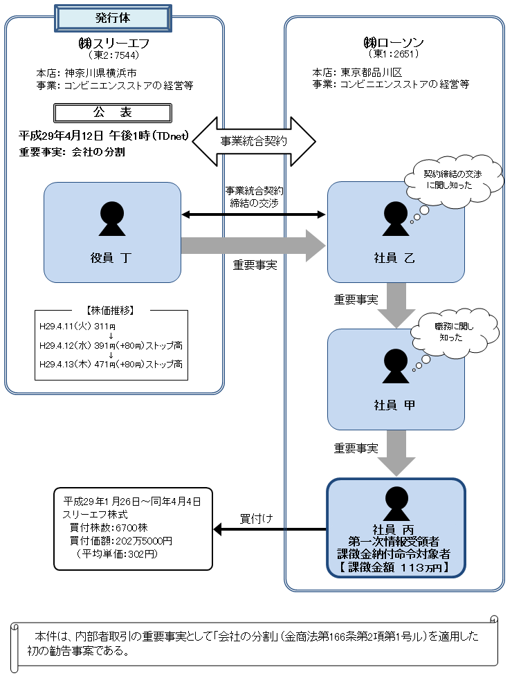 課徴金納付命令対象者は、株式会社ローソン(以下「ローソン」という。)に勤務していた者であるが、同社の社員甲から、株式会社スリーエフ(以下「スリーエフ」という。)の業務を執行する機関が会社の分割を行うことについての決定をした旨の重要事実の伝達を受けながら、前記重要事実の公表がされた平成29年4月12日より前の同年1月26日から同年4月4日までの間、自己の計算において、スリーエフ株式合計6700株を買付価額合計202万5000円で買い付けたものである。