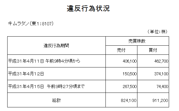 証券取引等監視委員会は、キムラタン株式に係る相場操縦について検査した結果、下記のとおり法令違反の事実が認められたので、本日、内閣総理大臣及び金融庁長官に対して、金融庁設置法第20条第1項の規定に基づき、課徴金納付命令を発出するよう勧告を行った。