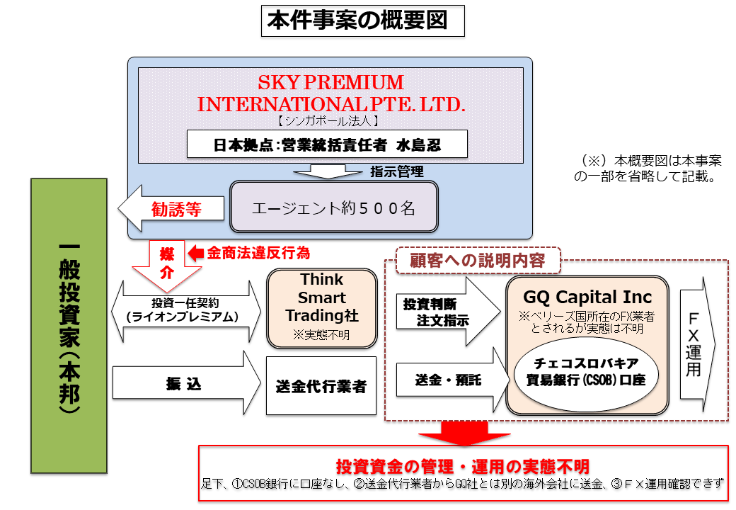 ※ ライオンプレミアムという商品は、Think Smart Trading社の運用指示に基づき、GQ CAPITAL INC.(平成27年に、ベリーズ国において設立された外国為替証拠金取引取扱業者と説明されている。以下「GQ社」という。)において外国為替証拠金取引(FX取引)を実施するものであり顧客からの同商品への投資資金は、チェコスロバキア貿易銀行(以下「CSOB銀行」という。)に開設されたGQ社名義の口座において、分別管理される、と説明されている。