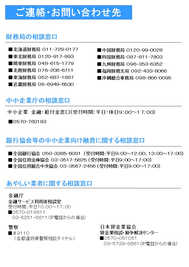 事業者の皆様の資金繰り支援や相談窓口のご案内につきましては、金融庁ウェブサイト「新型コロナウイルス感染症関連情報」をご参照願います。